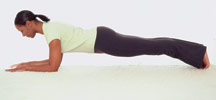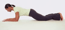 2. در این حالت زانوهای خود را از زمین بلند کنید طوری که تمام فشار وزن بدن روی ساعد ها و کف با باشد ، سعی کنید بدن خود را در یک خط مستقیم از نوک پا تا نوک سر در یک خط مستقیم ، بدون شکستگی ، قراردهید . در این حالت نباید نفس خود را حبس کنید ، بلکه بطور معمول نفس بکشید و به مدت ده ثانیه خود را در این حالت نگه دارید. سپس برای استراحت تنها زانو ها - اگر در ابتدا احساس ضعف کردید میتوانید شکم خود را نیز - روی زمین بگذارید.
