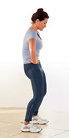 1. بایستید ، پاهای خود را به اندازه عرض کمر بازکنید ، کمی زانوهای خود را خم کنید ، لگن خود را به سمت جلو قوس دهید ، انگار که میخواهیدپایین لگن خود را به بالا بکشید ، و استخوان دنبالیچه خود را به سمت زمین نشانه روید.