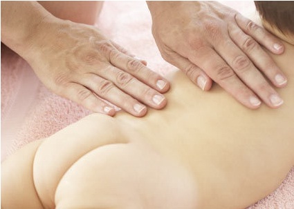 سپ کودک خود را به روی شکم بچرخانید و پشت او را با سرانگشتان خود ، از دو طرف ستون فقرات ، از پشت گردن تا کشاله ران بصورت حرکات مدور بمالید.