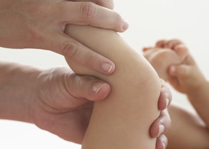 کف یکی از دستان خود را بطور مورب پایین گردن و روی سینه کاملا پهن کرده و به سمت رانهای کودک به آرامی مالش دهید. این کار را جند مرتبه به نوبت با هر یک از دو دست خود تکرار کنید.