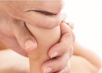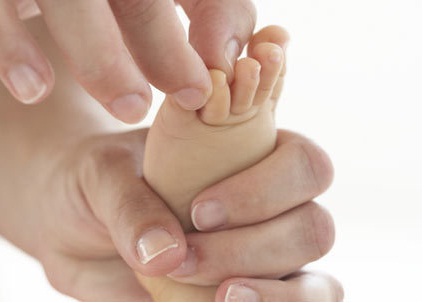 با انگشتان شصت خود کف پای نوزاد را در حرکات مدور تا نوک انگشتان پا بمالید.
